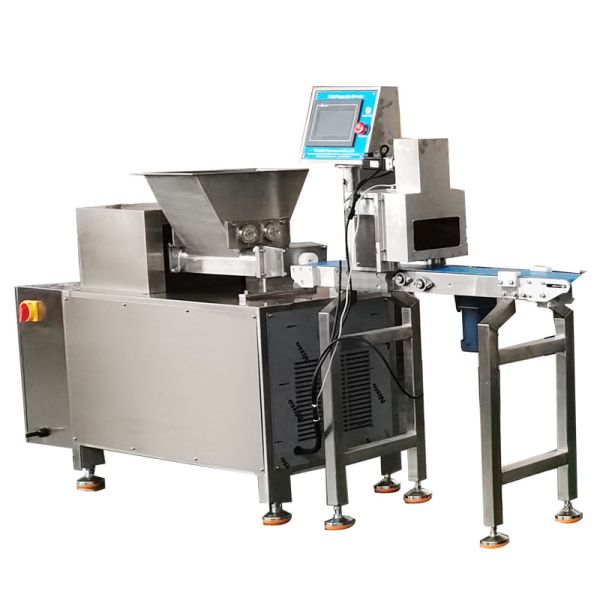 Dual Filling Injection: Two independent filling systems precisely inject streams of chocolate and date paste (or other fillings) into the center of the protein dough.